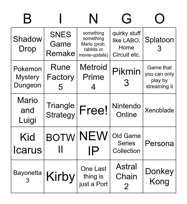 This bingo card has a free space and 24 words: BOTW II, Kirby, Metroid Prime 4, Bayonetta 3, Splatoon 3, Shadow Drop, Pokemon Mystery Dungeon, SNES Game Remake, Nintendo Online, NEW IP, Pikmin 3, Mario and Luigi, Old Game Series Collection, Persona, Rune Factory 5, Astral Chain 2, Xenoblade, something something Mario (prob. rabbits or movie-update), Game that you can only play by streaming it, Triangle Strategy, Donkey Kong, Kid Icarus, quirky stuff like LABO, Home Circuit etc. and One Last thing is just a Port.