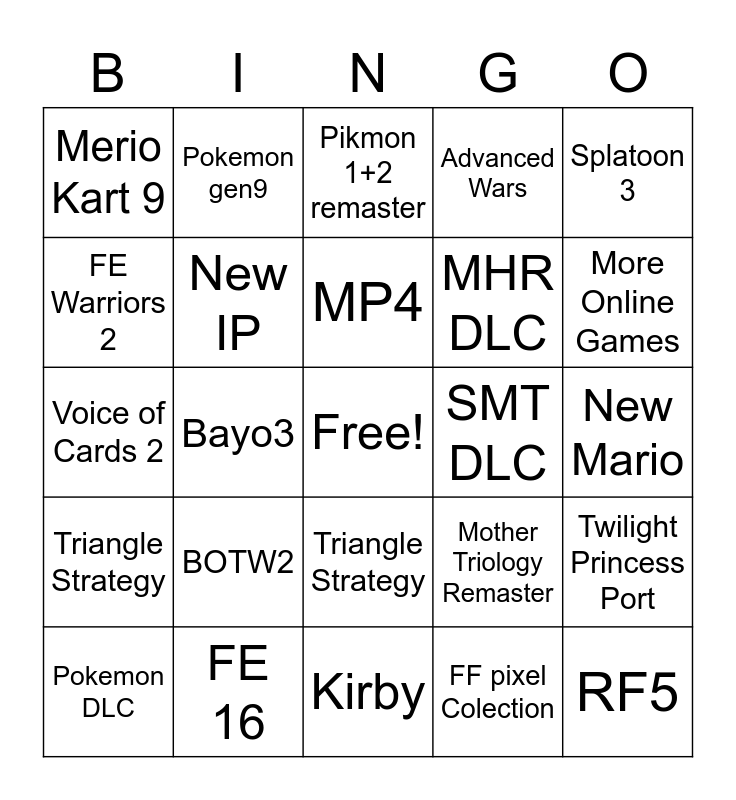 This bingo card has a free space and 24 words: BOTW2, FE 16, MP4, Pokemon DLC, Splatoon 3, Merio Kart 9, FE Warriors 2, Pokemon gen9, SMT DLC, Triangle Strategy, MHR DLC, Voice of Cards 2, Mother Triology Remaster, Twilight Princess Port, New IP, FF pixel Colection, New Mario, Pikmon 1+2 remaster, More Online Games, Bayo3, RF5, Triangle Strategy, Advanced Wars and Kirby.