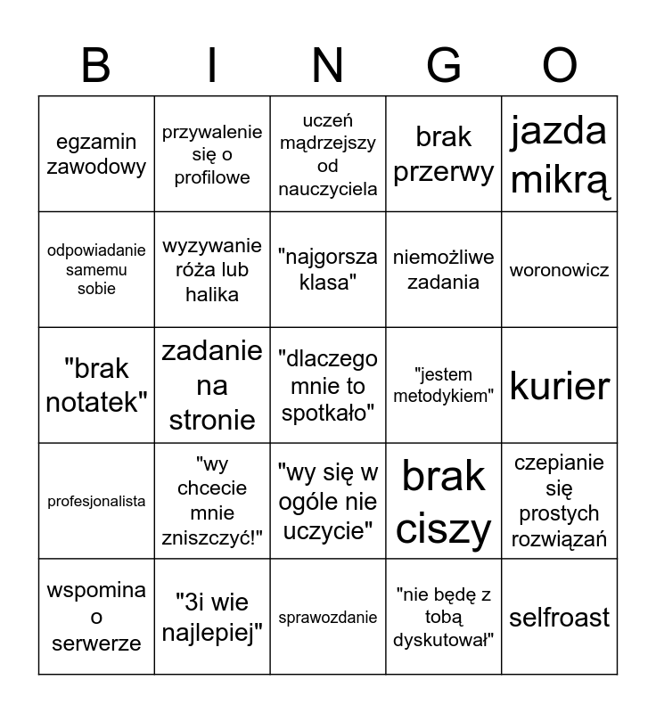 This bingo card has a free space and 39 words: mylenie imion, bahbah, jąkanie, wyzywanie róża lub halika, wspomina o serwerze, "wy się w ogóle nie uczycie", "najgorsza klasa", rozmawianie przez telefon, jazda mikrą, profesjonalista, zadanie na stronie, brak przerwy, selfroast, kurier, "jestem metodykiem", "wy chcecie mnie zniszczyć!", krzyki, egzamin zawodowy, linux, brak ciszy, odpowiadanie samemu sobie, sprawozdanie, niemożliwe zadania, woronowicz, robie to z pasji/dla was, marian coś zepsuł, dyrekcja, narzekanie na pracownie, złe tłumaczenie zagadnienia, przywalenie się o profilowe, obgadywanie uczniów, obgadywanie nauczycieli, uczeń mądrzejszy od nauczyciela, "3i wie najlepiej", "nie będę z tobą dyskutował", wspomina o muzyce, czepianie się prostych rozwiązań, "brak notatek" and porównanie do 3ig.