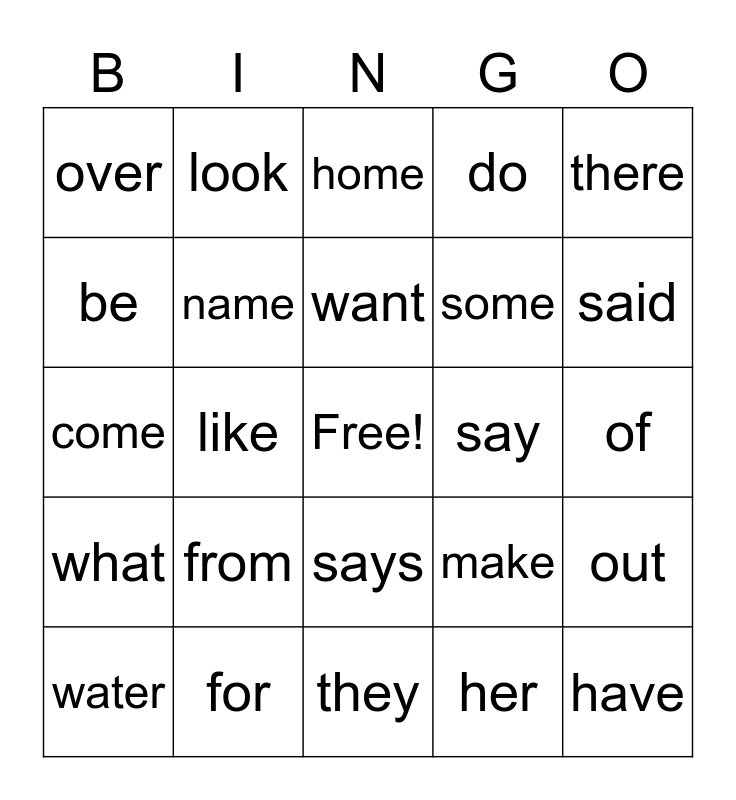 This bingo card has a free space and 24 words: from, for, want, water, there, over, be, look, say, says, some, come, make, out, name, her, of, home, said, like, have, what, do and they.