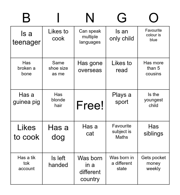 This bingo card has a free space and 24 words: Has a dog, Is left handed, Has gone overseas, Has a tik tok account, Favourite colour is blue, Is a teenager, Has broken a bone, Likes to cook, Plays a sport, Has a cat, Likes to read, Has a guinea pig, Favourite subject is Maths, Has siblings, Same shoe size as me, Was born in a different state, Is the youngest child, Can speak multiple languages, Has more than 5 cousins, Has blonde hair, Gets pocket money weekly, Likes to cook, Is an only child and Was born in a different country.