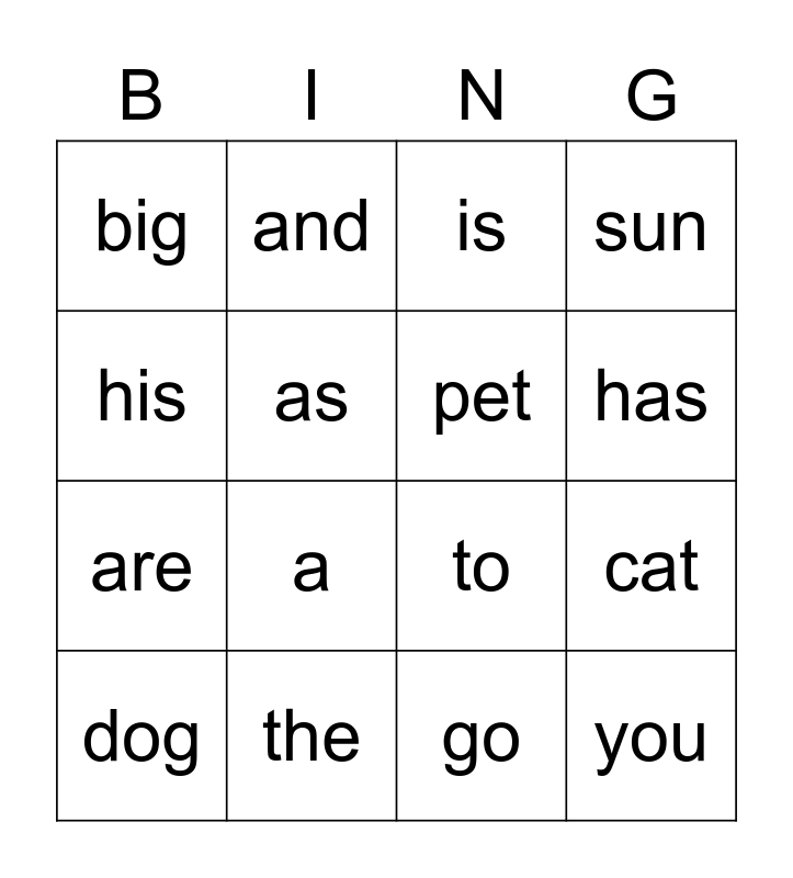 This bingo card has 16 words: the, cat, is, big, are, and, to, go, his, as, dog, sun, a, has, pet and you.