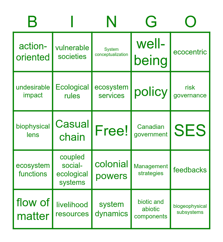 This bingo card has a free space and 25 words: coupled social-ecological systems, system dynamics, ecosystem services, flow of matter, ecocentric, action-oriented, undesirable impact, vulnerable societies, Canadian government, colonial powers, policy, biophysical lens, Management strategies, feedbacks, Ecological rules, Ostrom, SES, System conceptualization, risk governance, Casual chain, biogeophysical subsystems, livelihood resources, ecosystem functions, well-being and biotic and abiotic components.