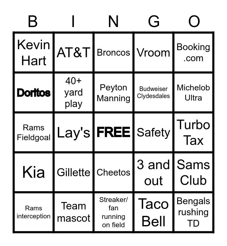 This bingo card has a free space and 67 words: BMW, Expedia, Seth Rogan, Sams Club, Toyota, Bud Light Seltzer, AT&T, Cocoa Cola, Peyton Manning, Irish Spring, Cheetos, 100+ yards rushing by runningback, Turbo Tax, Booking .com, E-Trade, Doritos, Lay's, Kevin Hart, Pepsi, Budweiser Clydesdales, Gillette, Kia, Vroom, Taco Bell, Crypto .com, Avocados from Mexico, Busch Light, Nissan (Thrill Driver), Michelob Ultra, Rams rushing TD, Bengals rushing TD, Rams passing TD, Bengals passing TD, Rams sack, Bengals sack, Rams interception, Bengals Interception, 3 and out, Rams Fieldgoal, Bengals fieldgoal, Fumble, 40+ yard play, Safety, Challenge, Injury timeout, Heads coinflip, Tails coinflip, Team mascot, 40+ yard fieldgoal, Lions, Broncos, Georgia, Touchback, Fair catch, Dog, Streaker/ fan running on field, Roger Goodell, Bucaneers, Tom Brady, Previous Super Bowl logo, Chevrolet, Ford, Underarmor, Pizza hut, Old spice, UPS and FedEx.