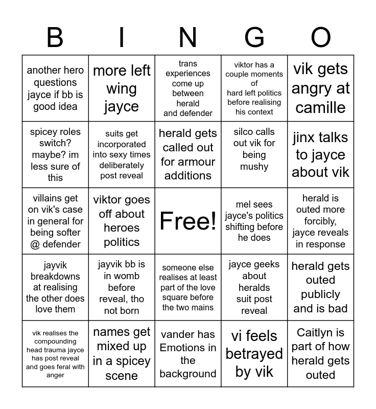 This bingo card has a free space and 24 words: jayvik bb is in womb before reveal, tho not born, names get mixed up in a spicey scene, herald gets called out for armour additions, vik realises the compounding head trauma jayce has post reveal and goes feral with anger, vik gets angry at camille, another hero questions jayce if bb is good idea, spicey roles switch? maybe? im less sure of this, more left wing jayce, mel sees jayce's politics shifting before he does, someone else realises at least part of the love square before the two mains, silco calls out vik for being mushy, villains get on vik's case in general for being softer @ defender, jayce geeks about heralds suit post reveal, herald gets outed publicly and is bad, suits get incorporated into sexy times deliberately post reveal, vi feels betrayed by vik, herald is outed more forcibly, jayce reveals in response, trans experiences come up between herald and defender, jinx talks to jayce about vik, viktor goes off about heroes politics, Caitlyn is part of how herald gets outed, jayvik breakdowns at realising the other does love them, viktor has a couple moments of hard left politics before realising his context and vander has Emotions in the background.
