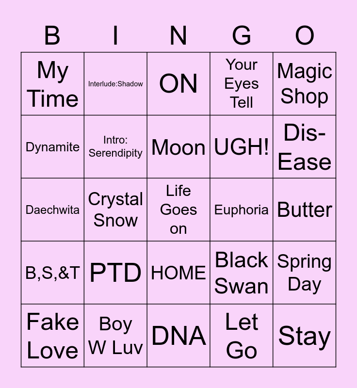 This bingo card has a free space and 24 words: PTD, Boy W Luv, Moon, Fake Love, Magic Shop, My Time, Dynamite, Interlude:Shadow, Euphoria, HOME, UGH!, Daechwita, Black Swan, Spring Day, Intro: Serendipity, Let Go, Butter, ON, Dis-Ease, Crystal Snow, Stay, B,S,&T, Your Eyes Tell and DNA.