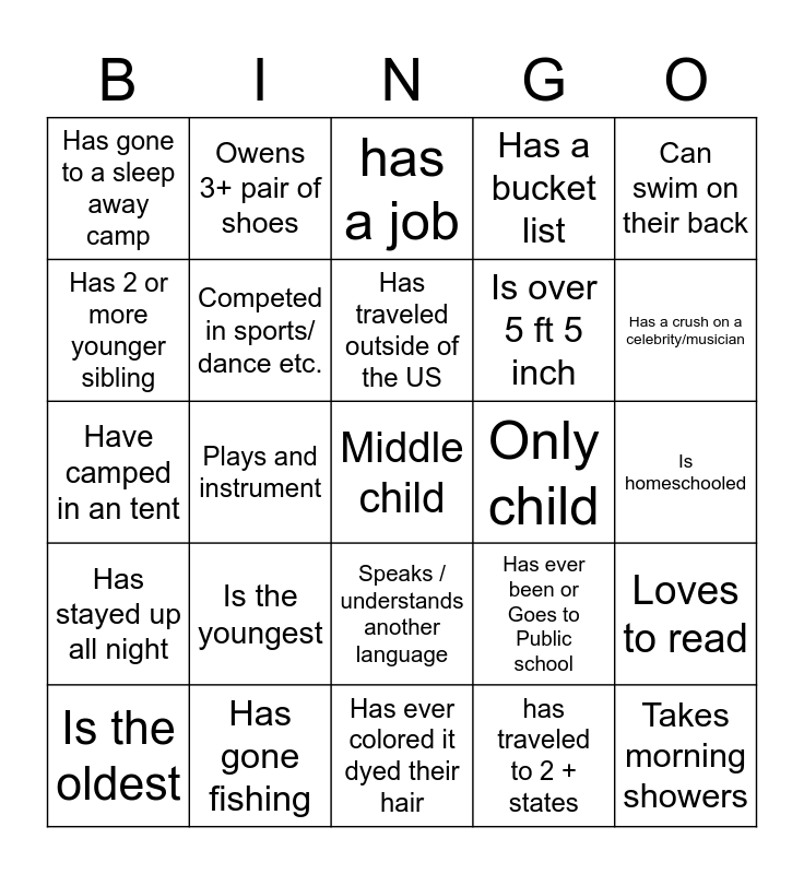This bingo card has 26 words: Has stayed up all night, Has gone fishing, Has traveled outside of the US, has traveled to 2 + states, Can swim on their back, Has gone to a sleep away camp, Competed in sports/ dance etc., has a job, Is over 5 ft 5 inch, Takes morning showers, Has 2 or more younger sibling, Plays and instrument, Has ever colored it dyed their hair, Has ever been or Goes to Public school, Is homeschooled, Can cook, Owens 3+ pair of shoes, Speaks / understands another language, Has a bucket list, Loves to read, Have camped in an tent, Is the youngest, Middle child, Only child, Has a crush on a celebrity/musician and Is the oldest.