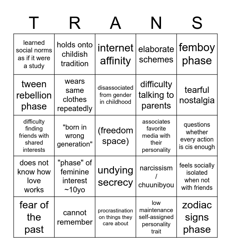 This bingo card has a free space and 24 words: "phase" of feminine interest ~10yo, cannot remember, disassociated from gender in childhood, fear of the past, femboy phase, learned social norms as if it were a study, tween rebellion phase, holds onto childish tradition, associates favorite media with their personality, undying secrecy, difficulty talking to parents, difficulty finding friends with shared interests, narcissism / chuunibyou, feels socially isolated when not with friends, wears same clothes repeatedly, low maintenance self-assigned personality trait, questions whether every action is cis enough, internet affinity, tearful nostalgia, "born in wrong generation", zodiac signs phase, does not know how love works, elaborate schemes and procrastination on things they care about.