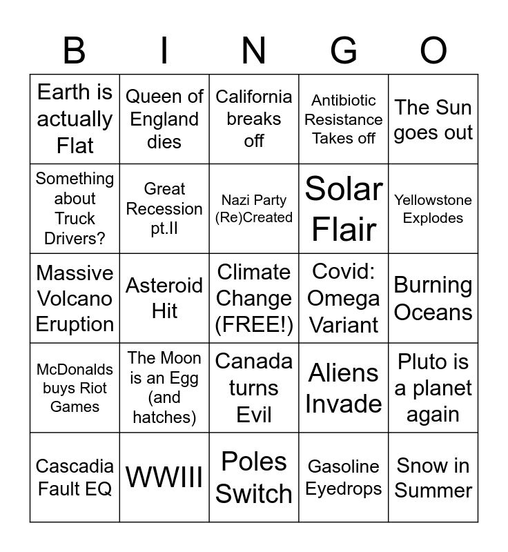 This bingo card has a free space and 24 words: The Moon is an Egg (and hatches), WWIII, Nazi Party (Re)Created, Cascadia Fault EQ, The Sun goes out, Earth is actually Flat, Something about Truck Drivers?, Queen of England dies, Covid: Omega Variant, Canada turns Evil, Solar Flair, Massive Volcano Eruption, Aliens Invade, Pluto is a planet again, Great Recession pt.II, Gasoline Eyedrops, Burning Oceans, California breaks off, Yellowstone Explodes, Asteroid Hit, Snow in Summer, McDonalds buys Riot Games, Antibiotic Resistance Takes off and Poles Switch.