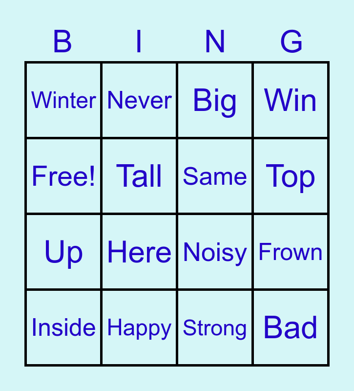 This bingo card has 16 words: Happy, Frown, Big, Winter, Up, Never, Noisy, Strong, Free!, Tall, Inside, Win, Here, Top, Same and Bad.