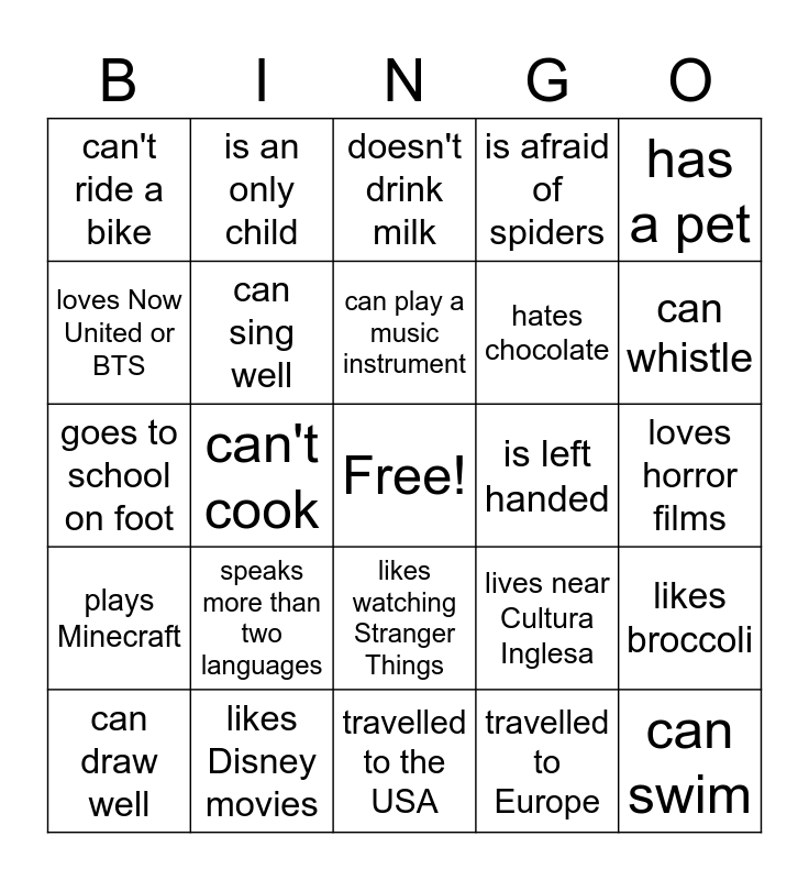 This bingo card has a free space and 29 words: can draw well, can dance ballet, can't cook, can count 1-10 in Spanish, can't ride a bike, doesn't drink milk, can sing well, speaks more than two languages, is left handed, likes Disney movies, loves horror films, can swim, travelled to the USA, travelled to Europe, can whistle, is 12 years old, likes watching Stranger Things, plays Minecraft, has a pet, goes to school on foot, lives near Cultura Inglesa, likes Japanese food, hates chocolate, loves Now United or BTS, is afraid of spiders, is an only child, likes broccoli, can play a music instrument and won a medal or prize.