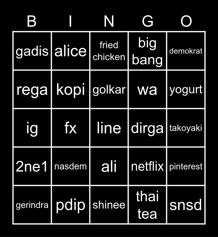 This bingo card has a free space and 24 words: nasdem, pdip, golkar, gerindra, demokrat, gadis, rega, alice, dirga, ali, wa, ig, netflix, pinterest, kopi, thai tea, takoyaki, fried chicken, yogurt, fx, snsd, 2ne1, big bang and shinee.