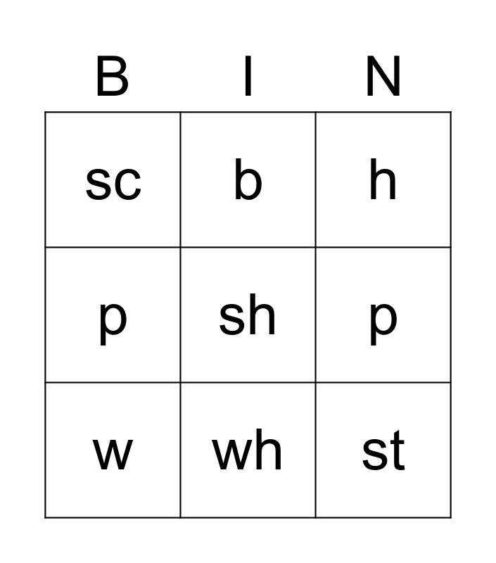This bingo card has a free space and 8 words: p, h, b, w, sc, st, p and wh.