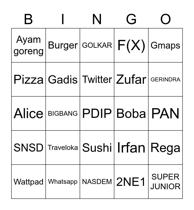 This bingo card has a free space and 24 words: Traveloka, Whatsapp, Twitter, Wattpad, Gmaps, Ayam goreng, Pizza, Burger, Boba, Sushi, Zufar, Alice, Irfan, Rega, Gadis, 2NE1, PAN, GOLKAR, GERINDRA, BIGBANG, SUPER JUNIOR, SNSD, F(X) and NASDEM.
