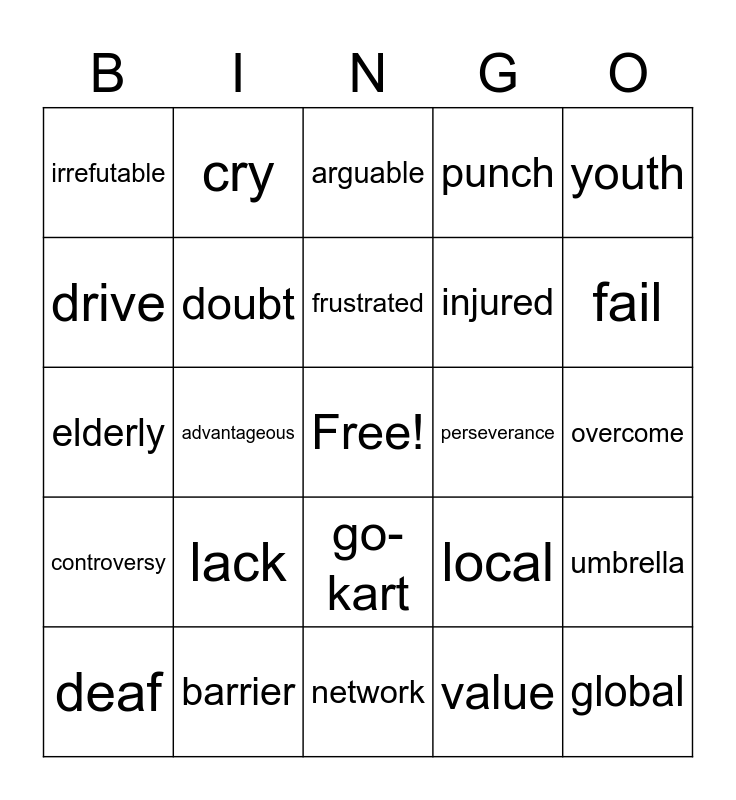 This bingo card has a free space and 29 words: deaf, blind, advantageous, detrimental, irrefutable, arguable, doubt, lack, perseverance, barrier, overcome, global, network, value, fail, succeed, go-kart, controversy, youth, elderly, local, article, injured, drive, punch, cry, umbrella, frustrated and achievement.
