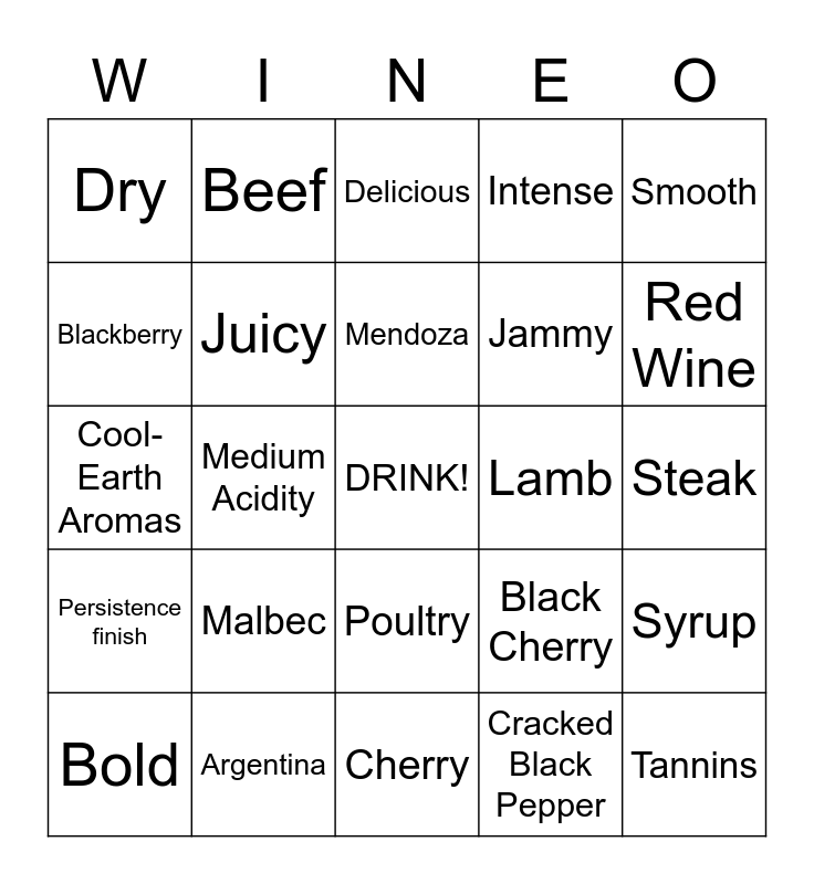 This bingo card has a free space and 24 words: Malbec, Argentina, Mendoza, Bold, Smooth, Dry, Blackberry, Beef, Lamb, Poultry, Jammy, Cool- Earth Aromas, Black Cherry, Syrup, Juicy, Cracked Black Pepper, Steak, Delicious, Red Wine, Medium Acidity, Tannins, Persistence finish, Intense and Cherry.