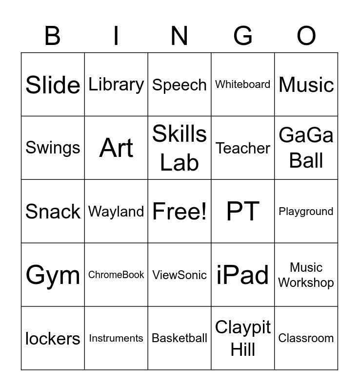 This bingo card has a free space and 32 words: Claypit Hill, Loker, Wayland, Cafeteria, Gym, Art, Music, Music Workshop, Library, Technology, Skills Lab, Speech, ILC, OT, PT, Principal, lockers, Snack, ViewSonic, ChromeBook, iPad, Recess, Playground, Instruments, Classroom, Whiteboard, Teacher, Swings, Slide, Basketball, 4 Square and GaGa Ball.