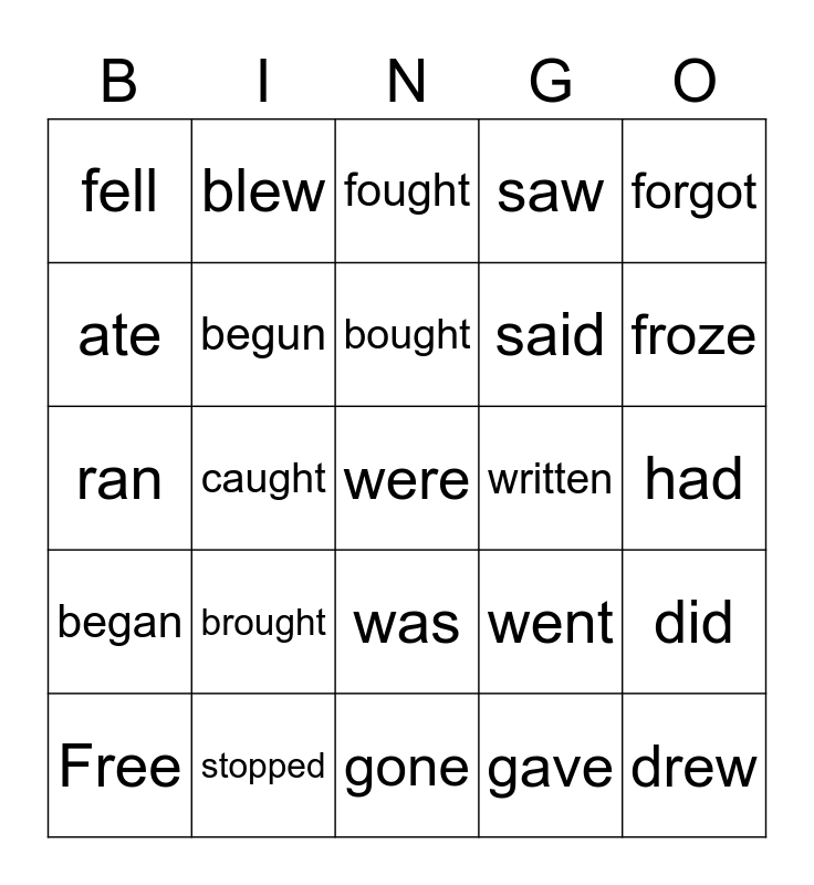 This bingo card has 27 words: went, drew, said, gone, ate, fought, blew, began, written, did, ran, saw, Free, stopped, froze, drank, begun, bought, brought, fell, had, gave, caught, were, was, forgot and flew.