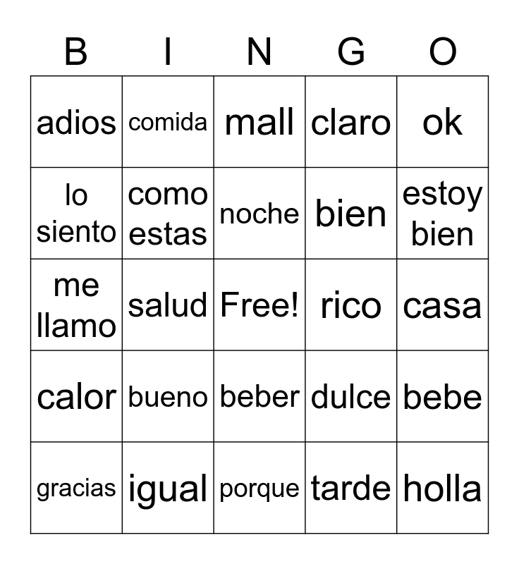This bingo card has a free space and 24 words: bueno, igual, noche, gracias, ok, adios, lo siento, comida, rico, beber, bien, me llamo, dulce, bebe, como estas, tarde, casa, mall, estoy bien, salud, holla, calor, claro and porque.