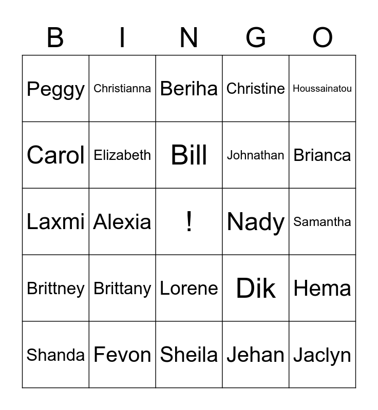 This bingo card has a free space and 91 words: Chouna, Nathaniel, Lorene, Laura, Duane, Deepak, La'Tisha, Veranda, Irena, Angie, Brandon, Abigail, Ndette, Samantha, Indira, Bill, Levieux, Amy, Brian, Michael, Scarlen, Hari, Sheila, Kendra, Laxmi, Fevon, Jamie, Jeffrey, Virgil, Bala, Samantha, Hema, Amanda, Brittney, Peggy, Christine, Beriha, James, Alexia, Brianca, Shanda, Carol, Chandra, Tirueayent, Tika, Dik, Denise, Pratibha, Mnet, Raphael, Chandra, Johnathan, Kassie, Elijah, Juan, Joel, Nady, Emily, Meguy, Purnima, Isaac, Maria, Zenash, Tadesse, Emmanuel, Michael, Sharon, Jehan, Kevin, Guillaine, Brittany, Jaclyn, Sandra, Maria, Christianna, Elizabeth, Megan, Edner, Erica, Tiffany, Courtney, Houssainatou, Jacob, Jared, Lory, Gladys, Christopher, Haymanot, Bala, Flore and Janette.
