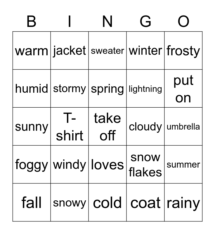 This bingo card has 30 words: snowy, dress, T-shirt, boots, warm, sweater, stormy, loves, cloudy, cold, umbrella, take off, coat, rainy, put on, thunder, snow flakes, foggy, windy, frosty, sunny, hot, jacket, lightning, humid, winter, summer, fall, spring and cool.