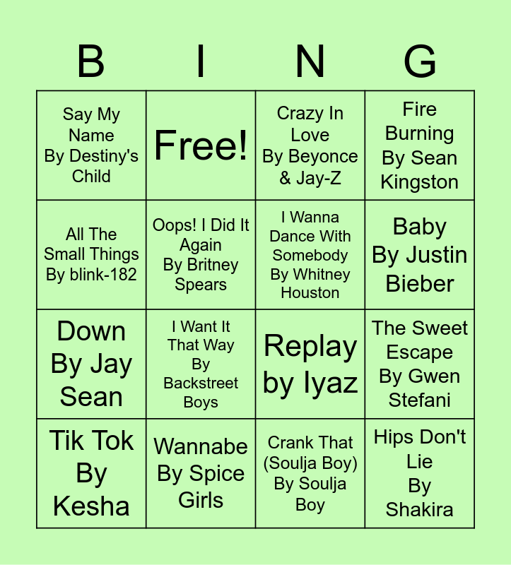 This bingo card has 19 words: Replay by Iyaz, I Gotta Feeling by Black Eyed Peas, Crazy In Love By Beyonce & Jay-Z, Hips Don't Lie By Shakira, The Sweet Escape By Gwen Stefani, All The Small Things By blink-182, Crank That (Soulja Boy) By Soulja Boy, Say My Name By Destiny's Child, Free!, Down By Jay Sean, I Want It That Way By Backstreet Boys, Oops! I Did It Again By Britney Spears, I Wanna Dance With Somebody By Whitney Houston, Wannabe By Spice Girls, Tik Tok By Kesha, Dynamite By Taio Cruz, Fire Burning By Sean Kingston, Baby By Justin Bieber and The Middle By Jimmy Eat World.