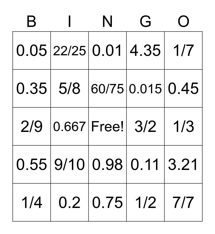 This bingo card has a free space and 29 words: 1/4, 0.125, 0.667, 2/5, 0.05, 0.01, 5/8, 9/10, 3/2, 0.2, 1/3, 7/7, 0.75, 1/2, 0.45, 14/18, 0.98, 0.55, 1/7, 2/9, 0.11, 2.6, 0.015, 0.35, 4.35, 22/25, 3.21, 60/75 and 101/5.