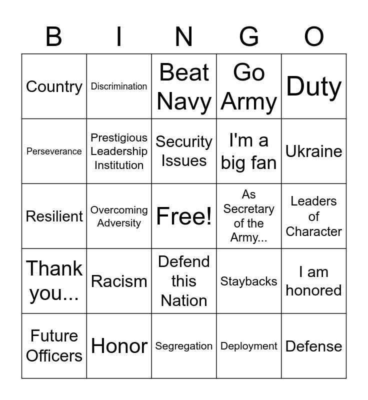 This bingo card has a free space and 24 words: Racism, Honor, Security Issues, Future Officers, Duty, Country, Perseverance, Discrimination, As Secretary of the Army..., Defend this Nation, I'm a big fan, Resilient, Staybacks, I am honored, Prestigious Leadership Institution, Deployment, Leaders of Character, Beat Navy, Ukraine, Overcoming Adversity, Defense, Thank you..., Go Army and Segregation.