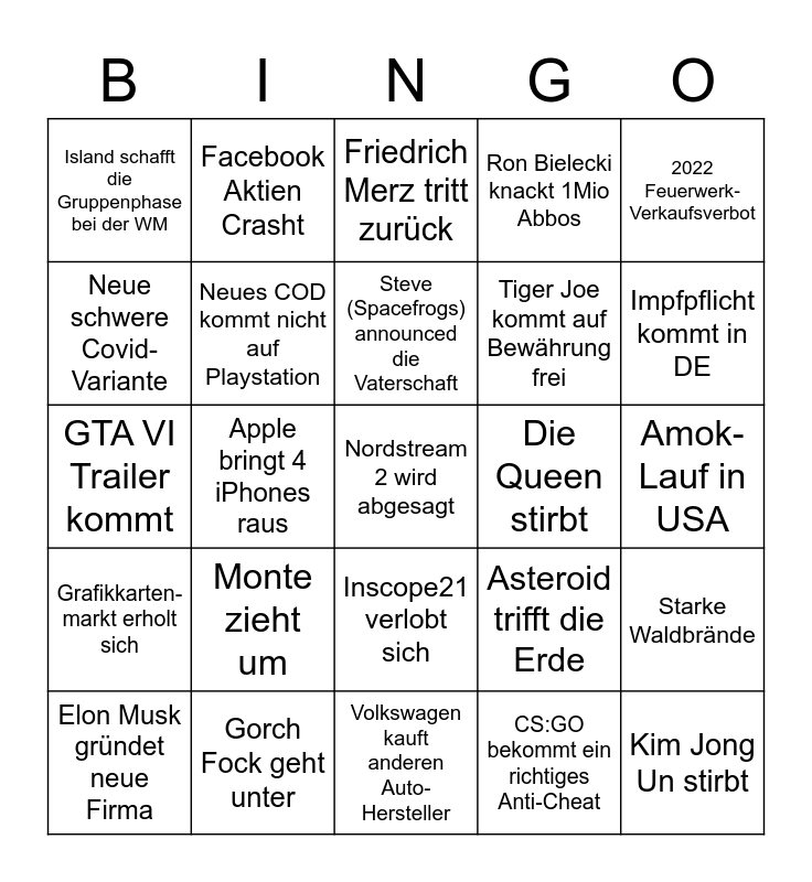 This bingo card has a free space and 24 words: Monte zieht um, Gorch Fock geht unter, Steve (Spacefrogs) announced die Vaterschaft, Elon Musk gründet neue Firma, 2022 Feuerwerk-Verkaufsverbot, Island schafft die Gruppenphase bei der WM, Neue schwere Covid-Variante, Facebook Aktien Crasht, Die Queen stirbt, Inscope21 verlobt sich, Tiger Joe kommt auf Bewährung frei, GTA VI Trailer kommt, Asteroid trifft die Erde, Starke Waldbrände, Neues COD kommt nicht auf Playstation, CS:GO bekommt ein richtiges Anti-Cheat, Amok-Lauf in USA, Friedrich Merz tritt zurück, Impfpflicht kommt in DE, Apple bringt 4 iPhones raus, Kim Jong Un stirbt, Grafikkarten- markt erholt sich, Ron Bielecki knackt 1Mio Abbos and Volkswagen kauft anderen Auto- Hersteller.