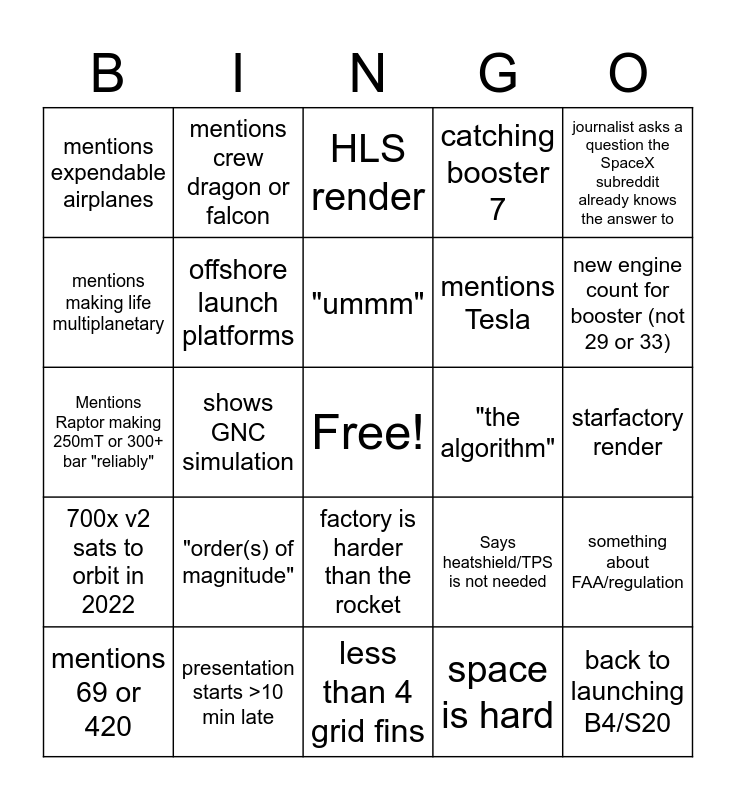 This bingo card has a free space and 24 words: "order(s) of magnitude", presentation starts >10 min late, "ummm", mentions 69 or 420, journalist asks a question the SpaceX subreddit already knows the answer to, mentions expendable airplanes, mentions making life multiplanetary, mentions crew dragon or falcon, "the algorithm", factory is harder than the rocket, mentions Tesla, Mentions Raptor making 250mT or 300+ bar "reliably", Says heatshield/TPS is not needed, something about FAA/regulation, offshore launch platforms, space is hard, starfactory render, HLS render, new engine count for booster (not 29 or 33), shows GNC simulation, back to launching B4/S20, 700x v2 sats to orbit in 2022, catching booster 7 and less than 4 grid fins.