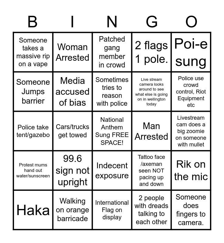 This bingo card has a free space and 24 words: 99.6 sign not upright, Walking on orange barricade, Sometimes tries to reason with police, Haka, Poi-e sung, Someone takes a massive rip on a vape, Someone Jumps barrier, Woman Arrested, Man Arrested, Indecent exposure, Live stream camera looks around to see what else is going on in wellington today, Police take tent/gazebo, Tattoo face /axeman seen NOT pacing up and down, Rik on the mic, Media accused of bias, 2 people with dreads talking to each other, Livestream cam does a big zoomie on someone with mullet, Patched gang member in crowd, Police use crowd control, Riot Equipment etc, Cars/trucks get towed, Someone does fingers to camera., Protest mums hand out water/sunscreen, 2 flags 1 pole. and International Flag on display.