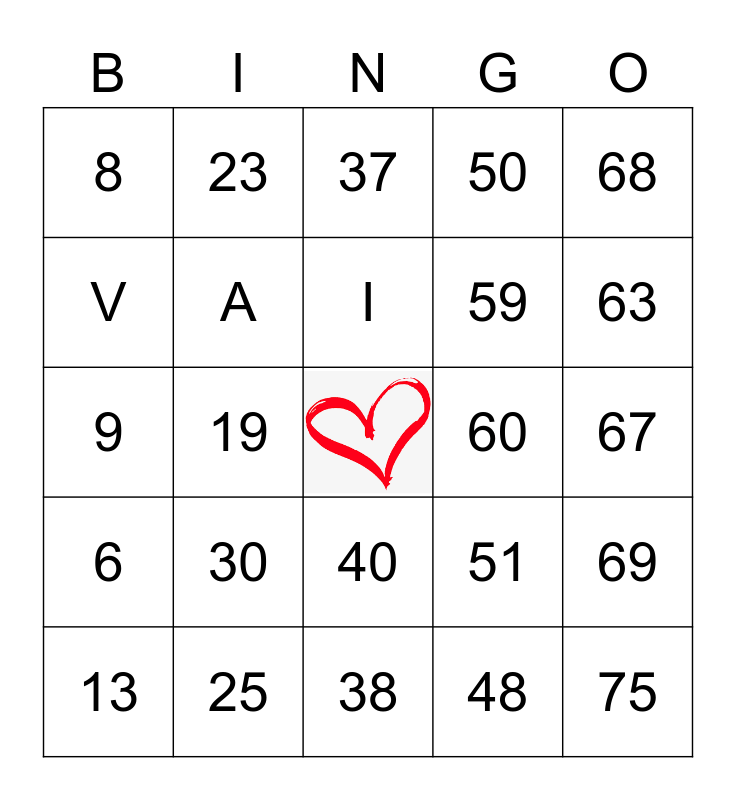 This bingo card has a free space and 90 words: 1, 16, 31, 46, 61, 2, 17, 32, 47, 62, 3, 18, 48, 63, 4, 19, 33, 49, 64, 5, 20, 34, 50, 65, 6, 21, 35, 51, 66, 7, 22, 36, 52, 67, 8, 23, 37, 53, 68, 9, 24, 38, 54, 69, 10, 25, 39, 55, 70, 11, 26, 40, 56, 71, 12, 27, 41, 57, 72, 13, 28, 42, 58, 73, 14, 29, 43, 59, 74, 15, 30, 44, 60, 75, V, A, 45, L, E, N, T, I, Heart, February, Chocolate, Candy, Card, Flowers, Love and Kiss.