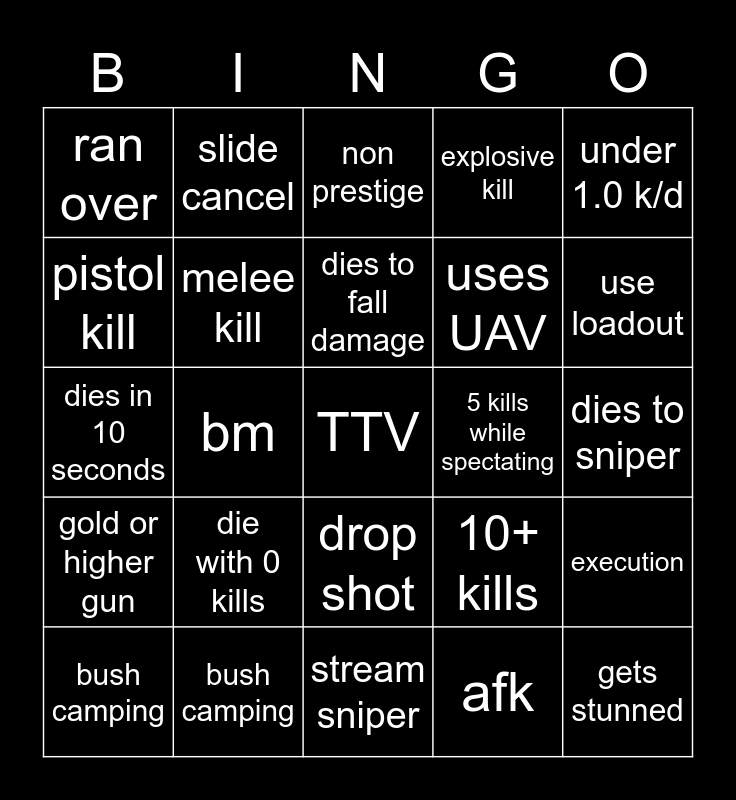 This bingo card has a free space and 24 words: die with 0 kills, bush camping, dies to fall damage, bush camping, under 1.0 k/d, ran over, pistol kill, slide cancel, 5 kills while spectating, drop shot, uses UAV, dies in 10 seconds, 10+ kills, execution, melee kill, afk, dies to sniper, non prestige, use loadout, bm, gets stunned, gold or higher gun, explosive kill and stream sniper.