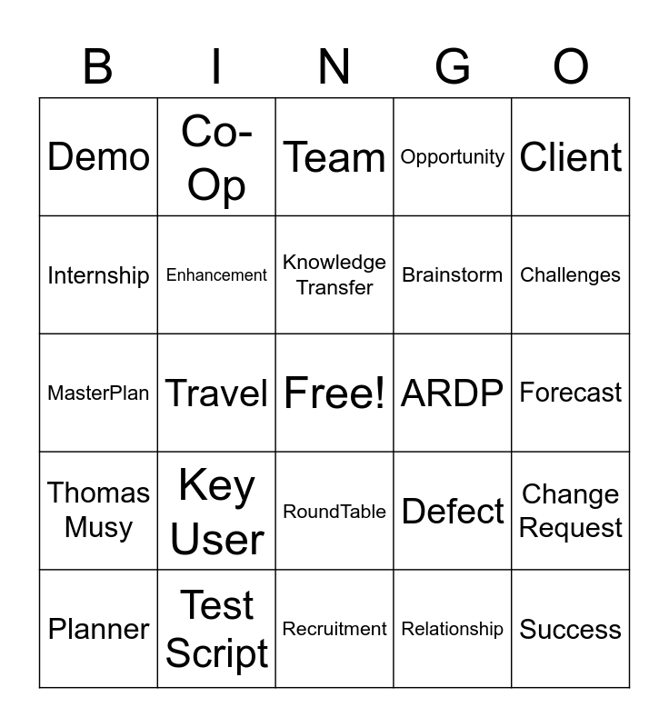 This bingo card has a free space and 24 words: Key User, Test Script, Knowledge Transfer, Planner, Client, Demo, Internship, Co-Op, ARDP, RoundTable, Brainstorm, MasterPlan, Defect, Change Request, Enhancement, Relationship, Forecast, Team, Challenges, Travel, Success, Thomas Musy, Opportunity and Recruitment.