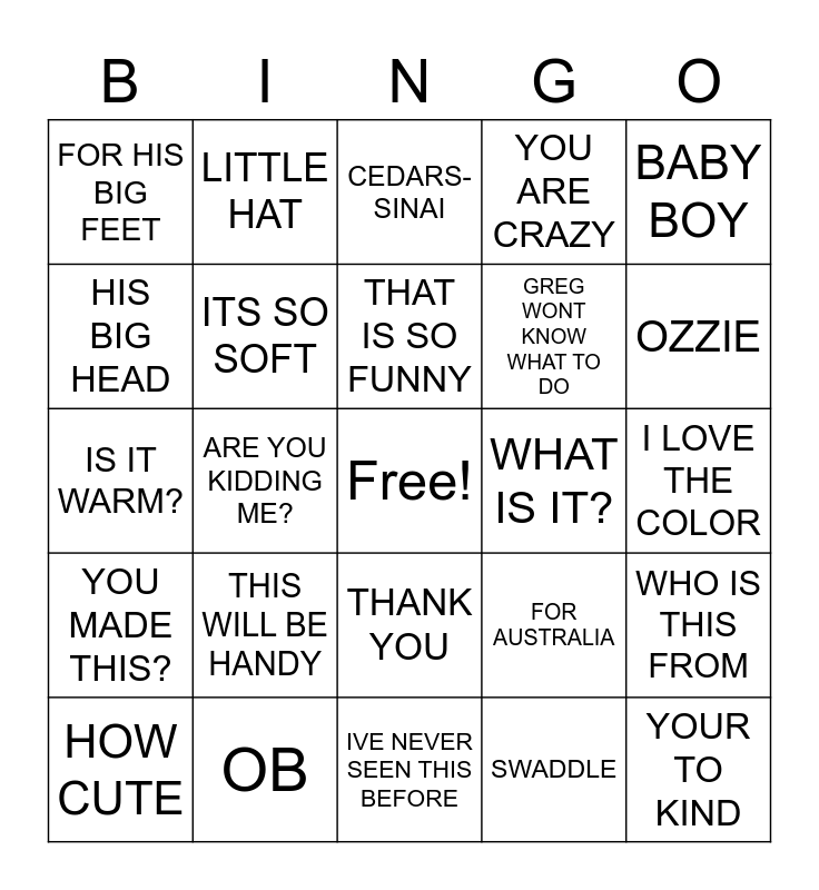 This bingo card has a free space and 39 words: I LOVE IT, ITS SO TINY, GREG WILL LOVE IT, ITS SO SOFT, HOW CUTE, THANK YOU, THAT IS SO FUNNY, LUCKY BABY, BABY BOY, YOU MADE THIS?, ARE YOU KIDDING ME?, YOU ARE CRAZY, YOUR TO KIND, I LOVE THE COLOR, WHAT IS IT?, THIS WILL BE HANDY, SO MANY OUTFITS, FOR HIS BIG FEET, FOR THE RIVER, FOR AUSTRALIA, HIS BIG HEAD, IVE NEVER SEEN THIS BEFORE, GREG WONT KNOW WHAT TO DO, OZZIE, HE IS SO LUCKY, ARE YOU KIDDING, HE JUST KICKED!, I LOVE SHOES, DIAPERS, LITTLE HAT, LABOR, CONTRACTIONS, CEDARS-SINAI, OB, SWADDLE, TAKE A PICTURE, WHO IS THIS FROM, IS IT WARM? and LOVE YOU!.