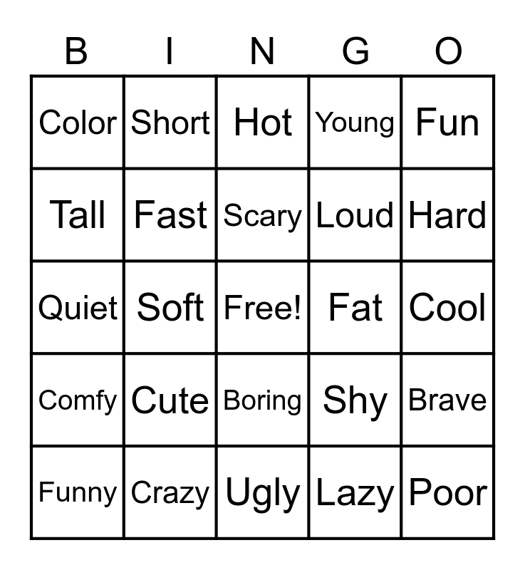 This bingo card has a free space and 24 words: Cute, Crazy, Scary, Funny, Fun, Color, Tall, Short, Fat, Boring, Loud, Quiet, Shy, Brave, Fast, Lazy, Cool, Hot, Hard, Soft, Poor, Comfy, Young and Ugly.