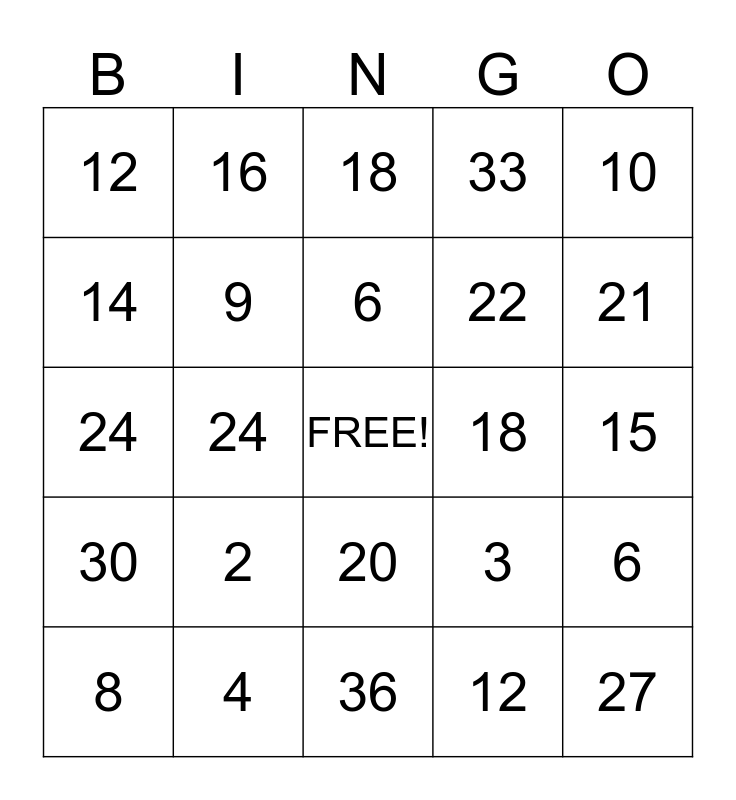 This bingo card has a free space and 24 words: 2, 4, 6, 8, 10, 12, 14, 16, 18, 20, 22, 24, 3, 6, 9, 12, 15, 18, 21, 24, 27, 30, 33 and 36.