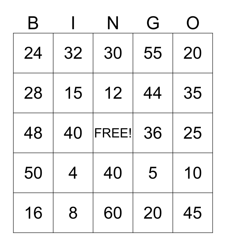 This bingo card has a free space and 24 words: 4, 8, 12, 16, 20, 24, 28, 32, 36, 40, 44, 48, 5, 10, 15, 20, 25, 30, 35, 40, 45, 50, 55 and 60.
