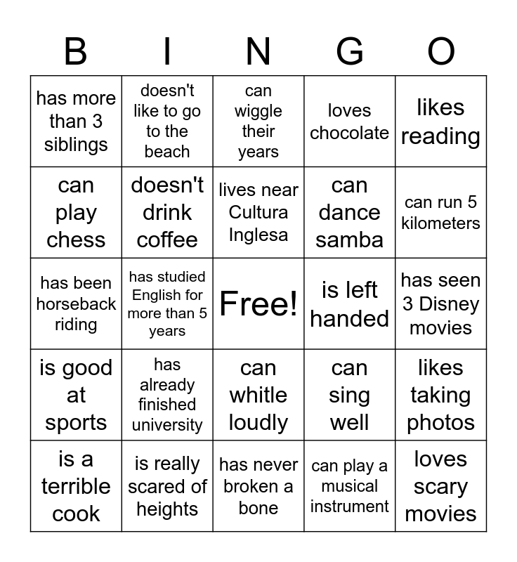 This bingo card has a free space and 29 words: is a terrible cook, can count up to 10 in Japanese, has studied English for more than 5 years, has a birthday in May, has more than 3 siblings, can wiggle their years, doesn't drink coffee, has already finished university, is left handed, is really scared of heights, has seen 3 Disney movies, loves scary movies, has never broken a bone, can play a musical instrument, can run 5 kilometers, has been abroad, can whitle loudly, is good at sports, likes reading, has been horseback riding, can sing well, is wearing shoes without laces, can dance samba, can play chess, loves chocolate, doesn't like to go to the beach, likes taking photos, lives near Cultura Inglesa and has a pet.