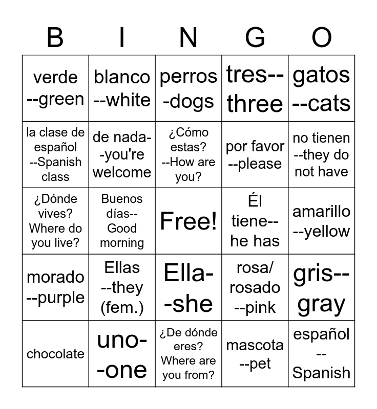 This bingo card has a free space and 44 words: Argentina, español --Spanish, Perú, chocolate, hotel, mascota --pet, perros -dogs, y--and, gatos --cats, uno--one, tres--three, Él tiene--he has, Ella--she, Ellas --they (fem.), ¿Cómo te llamas? What is your name?, ¿De dónde eres? Where are you from?, ¿Cuántos años tienes?, ¿Dónde vives? Where do you live?, hermanos --brothers or siblings, no tienen --they do not have, blanco --white, azul--blue, rojo--red, verde --green, marrón, café--brown, amarillo --yellow, Es el sol --It is the sun, naranja --orange, rosa/ rosado --pink, morado --purple, negro --black, gris--gray, dos--two, cinco --five, Buenos días--Good morning, Buenas noches --Good night, Hasta luego --See you later, Hasta mañana --See you tomorrow, ¿Cómo estas? --How are you?, la clase de español --Spanish class, por favor --please, gracias --thank you, de nada--you're welcome and adiós -- goodbye.