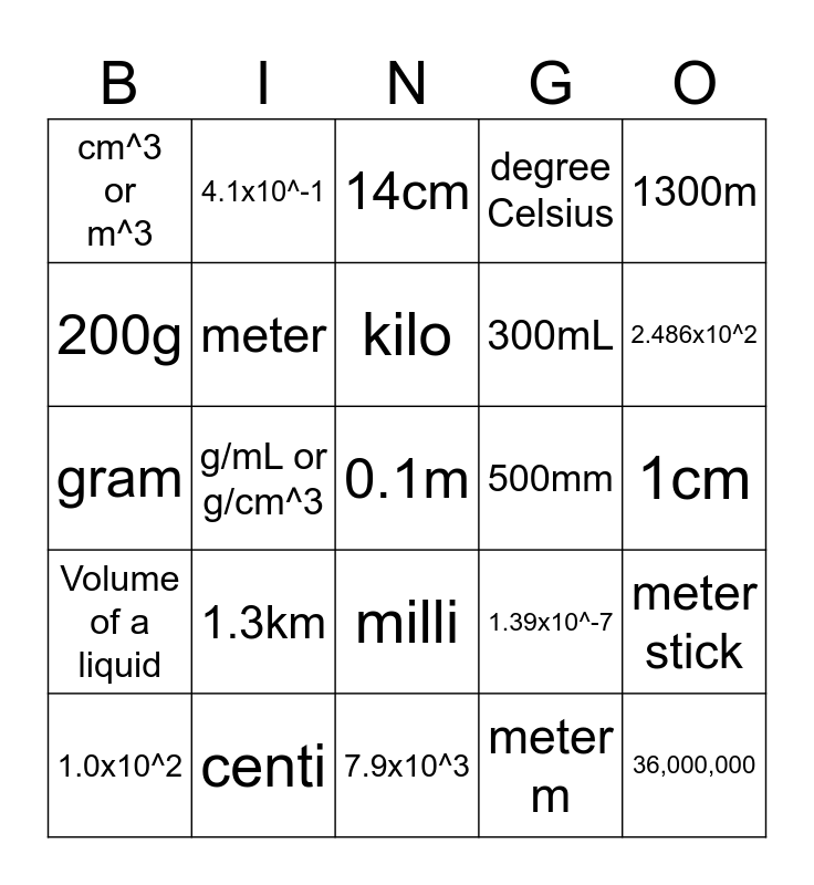 This bingo card has 40 words: balance, gram, Liter, meter, centi, milli, kilo, 2m, 1300m, Volume of a liquid, g/mL or g/cm^3, degree Celsius, 0.1m, 1cm, 500mm, 1.3km, second, cm^3 or m^3, 90cm, 14cm, meter stick, meter m, 300mL, 200g, 1.1m, 0.00031, 7.6x10^-6, 8.6x10^-9, 36,000,000, 0.0000692, 841,000, 1.0x10^2, 0.00002, 1.39x10^-7, 2.486x10^2, 7.9x10^3, 1.234x10^0, 10, 4.1x10^-1 and 0.0010.