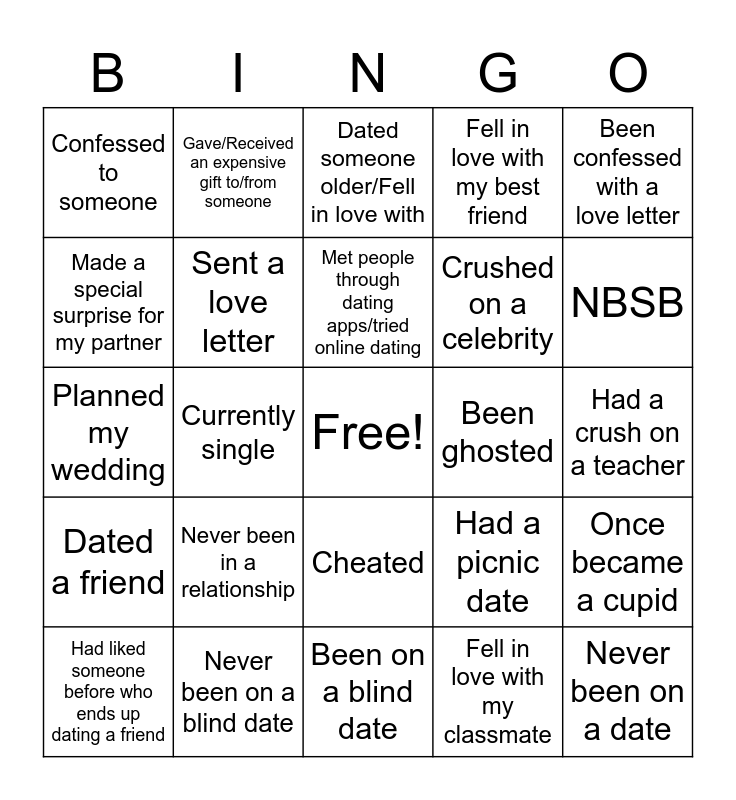 This bingo card has a free space and 25 words: Never been in a relationship, Been on a blind date, Met people through dating apps/tried online dating, Had liked someone before who ends up dating a friend, Been confessed with a love letter, Confessed to someone, Made a special surprise for my partner, Gave/Received an expensive gift to/from someone, Been ghosted, Cheated, Crushed on a celebrity, Planned my wedding, Had a picnic date, Once became a cupid, Sent a love letter, Shared a crush with a friend, Had a crush on a teacher, Dated someone older/Fell in love with, NBSB, Currently single, Never been on a date, Never been on a blind date, Dated a friend, Fell in love with my best friend and Fell in love with my classmate.