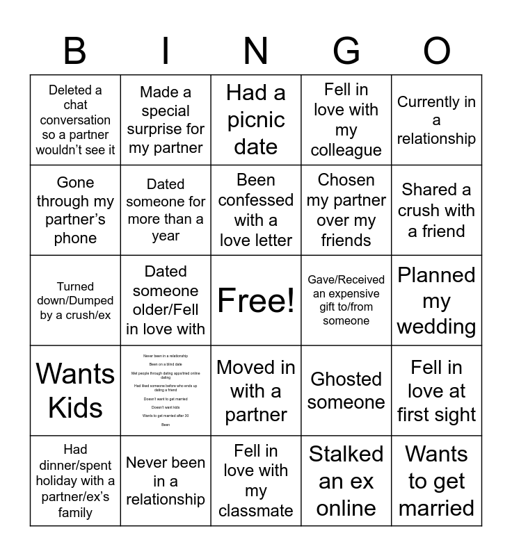 This bingo card has a free space and 24 words: Never been in a relationship Been on a blind date Met people through dating apps/tried online dating Had liked someone before who ends up dating a friend Doesn’t want to get married Doesn’t want kids Wants to get married after 30 Been, Never been in a relationship, Been confessed with a love letter, Had dinner/spent holiday with a partner/ex’s family, Currently in a relationship, Deleted a chat conversation so a partner wouldn’t see it, Gone through my partner’s phone, Made a special surprise for my partner, Gave/Received an expensive gift to/from someone, Moved in with a partner, Chosen my partner over my friends, Turned down/Dumped by a crush/ex, Ghosted someone, Fell in love at first sight, Dated someone for more than a year, Stalked an ex online, Planned my wedding, Had a picnic date, Shared a crush with a friend, Dated someone older/Fell in love with, Wants to get married, Wants Kids, Fell in love with my colleague and Fell in love with my classmate.
