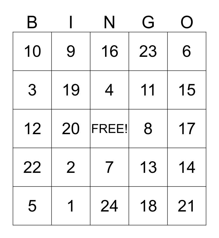 This bingo card has a free space and 24 words: 2, 1, 4, 5, 6, 10, 3, 9, 8, 7, 11, 12, 13, 14, 19, 18, 17, 16, 15, 20, 21, 22, 23 and 24.