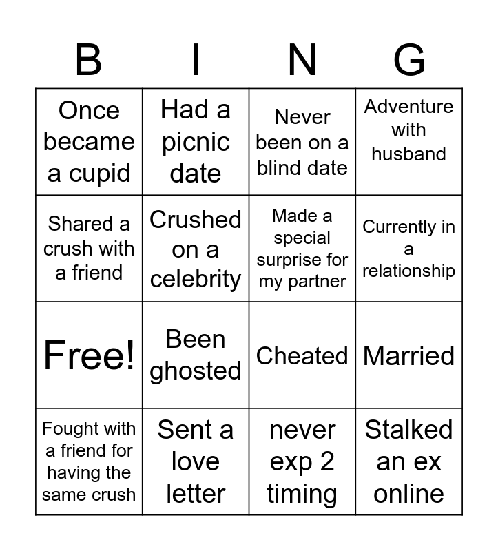 This bingo card has 20 words: Married, Has Kids, Never been on a blind date, Dated someone older/Fell in love with, Fought with a friend for having the same crush, Shared a crush with a friend, Sent a love letter, Once became a cupid, Free!, Had a picnic date, Been ghosted, Cheated, Crushed on a celebrity, Stalked an ex online, Made a special surprise for my partner, Deleted a chat conversation so a partner wouldn’t see it, Currently in a relationship, Adventure with husband, never exp 2 timing and kiss a foreinger.