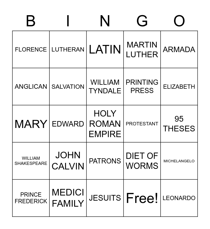 This bingo card has 32 words: Free!, HENRY VIII, EDWARD, COUNCIL OF TRENT, WILLIAM SHAKESPEARE, SALVATION, ARMADA, MICHELANGELO, LUTHERAN, LEONARDO, WILLIAM TYNDALE, LATIN, PREDESTINATION, GEOCENTRIC, PROTESTANT, POPE LEO X, PRINCE FREDERICK, MARY, PATRONS, JOHN CALVIN, DIET OF WORMS, SPAIN, 95 THESES, MEDICI FAMILY, HOLY ROMAN EMPIRE, MARTIN LUTHER, PRINTING PRESS, ANGLICAN, FLORENCE, JESUITS, TELESCOPE and ELIZABETH.