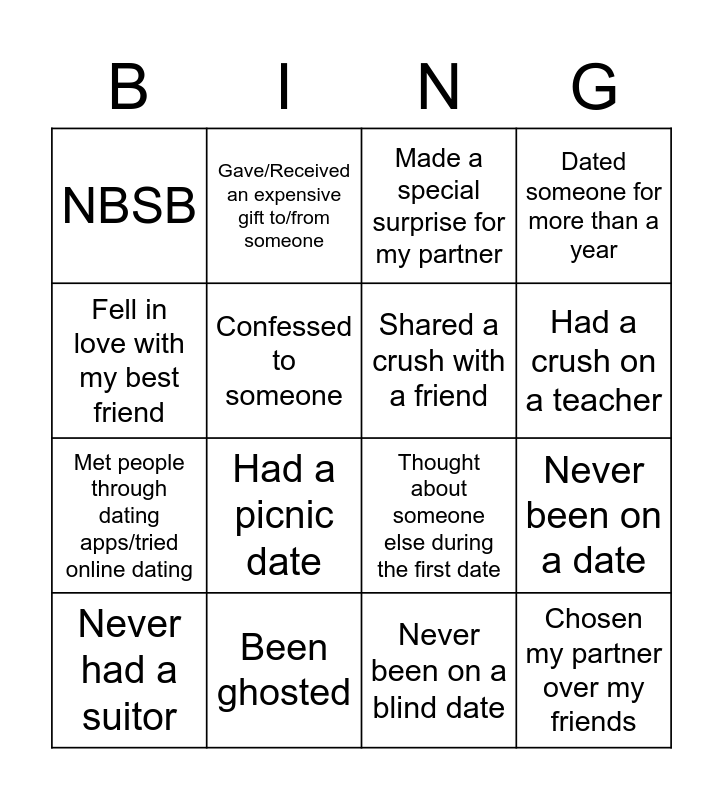 This bingo card has 28 words: Free!, Been on a blind date, Met people through dating apps/tried online dating, Been confessed with a love letter, Confessed to someone, Made a special surprise for my partner, Gave/Received an expensive gift to/from someone, Chosen my partner over my friends, Been ghosted, Fell in love at first sight, Thought about someone else during the first date, Dated someone for more than a year, Crushed on a celebrity, Planned my wedding, Had a picnic date, Once became a cupid, Sent a love letter, Shared a crush with a friend, Had a crush on a teacher, Dated someone older/Fell in love with, NBSB, Currently single, Never had a suitor, Never been on a date, Never been on a blind date, Dated a friend, Fell in love with my best friend and Fell in love with my classmate.
