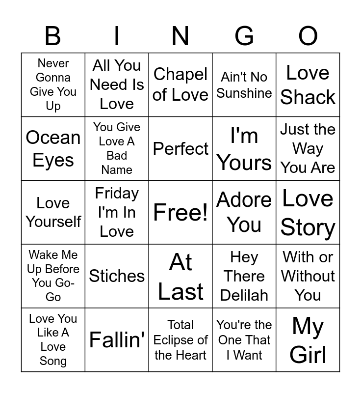 This bingo card has a free space and 34 words: L-O-V-E, You're the One That I Want, Crazy Little Thing Called Love, Love is an Open Door, Wake Me Up Before You Go-Go, You Give Love A Bad Name, Love Shack, Love You Like A Love Song, All You Need Is Love, Can't Help Falling in Love, Perfect, Chapel of Love, What Makes You Beautiful, Rewrite the Stars, Adore You, Just the Way You Are, Fallin', Love Yourself, Stiches, Hey There Delilah, At Last, Faithfully, Never Gonna Give You Up, Love Story, Total Eclipse of the Heart, My Girl, Ain't No Sunshine, Every Breath You Take, I'm Yours, Ocean Eyes, Wonderwall, Friday I'm In Love, With or Without You and Hey There Delilah.