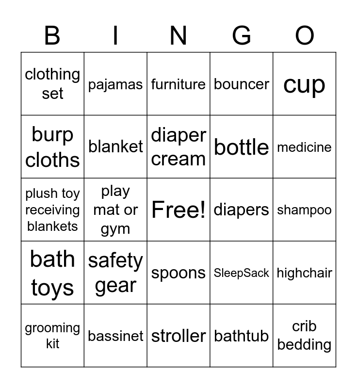 This bingo card has a free space and 60 words: baby monitor, bassinet, bath robe, bath toys, bathtub, bib, blanket, book, bottle, bottle warmer, bouncer, bowl or plate, burp cloths, car seat, cart cover, clothing set, crib bedding, cup, diaper bag, diaper cream, diapers, furniture, grooming kit, highchair, humidifier, jumper, laundry detergent, lotion, medicine, mittens, musical toy, nursing pillow, Onesies, pacifier, pajamas, photo frame, piggy bank, play mat or gym, play yard, plush toy receiving blankets, room decor, safety gear, shampoo, shoes, SleepSack, sling or carrier, socks or booties, something hand made, something personalized, spoons, stroller, stroller toy, swaddle wrap, swing or rocker, teethers, thermometer, utensils, wash cloths, wipe warmer and wipes.
