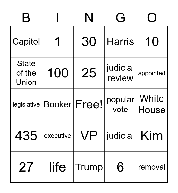 This bingo card has a free space and 34 words: 4, 6, 2, 9, 435, 100, 10, 27, 1, 3, 25, 30, 35, electoral college, popular vote, appointed, life, legislative, executive, judicial, VP, Speaker of the House, Capitol, White House, Trump, removal, Harris, veto, judicial review, State of the Union, declares war, Booker, Kim and treason.